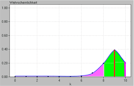 Komplementär dazu reicht der "Ablehnungbereich" hier von 0 (= gar keinem) Treffer bis 7 Treffer: wenn der Schütze also zwischen 0 und 7 mal trifft, glauben wir es ihm nicht, dass er üblicherweise mit der Wahrscheinlichkeit p = 0,9 trifft, und unterstellen ihm, dass er ein Angeber ist.