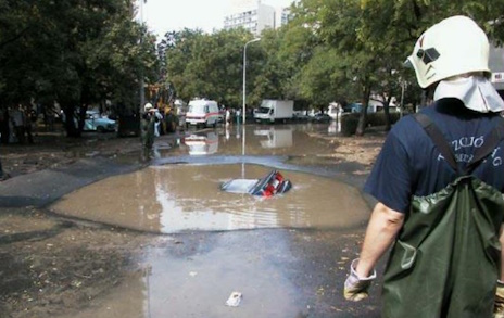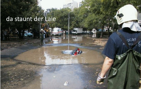"irre, da ist ein riesiges Loch in der Straße, das randvoll mit Wasser ist, und mittendrin dümpelt ein Auto rum",