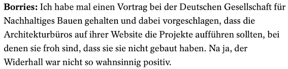 "Gustav nickte in Richtung der neuen Häuser, viereckig [rechteckig?] und vernünftig mit verputzten Fassaden in Orange und Gelb. »Ein Denkmal für die Idiotie der Stadt«, sagte er." |