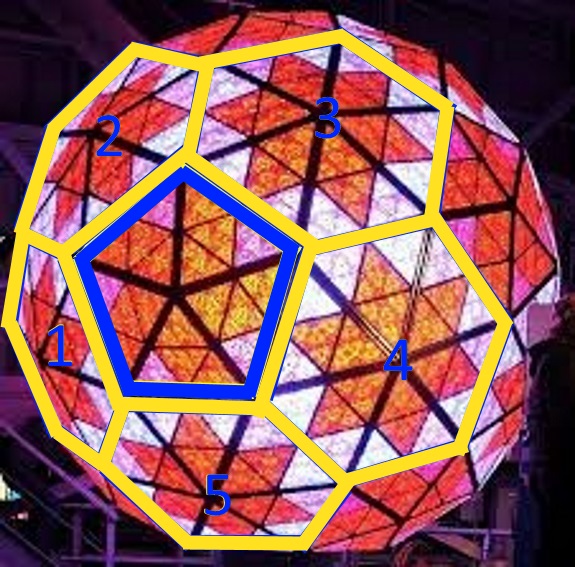 Wenn man aber diese beiden Grundbestandteile, also Fünf- und Secksecke, entdeckt hat, sieht man vielleicht auch, wie sie zueinander liegen: es sind immer fünf Sechsecke ringförmig um ein Fünfeck angeordnet: