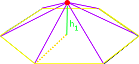 muss aber noch dafür gesorgt werden, dass die neu entstandenen Pyramidenspitzen • ebenfalls auf dieser Kugel liegen, dass also die fünf- und sechseckigen Pyramiden die passenden Höhen h1 und h2 haben.