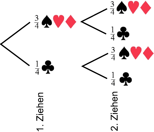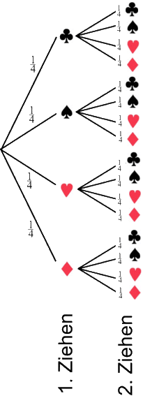 Eine erste Veranschaulichung von Zufallsexperimenten bieten Baumdiagramme. Bei unserer oben gestellten Aufgabe sieht das Baumdiagramm so aus: