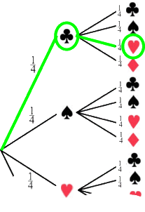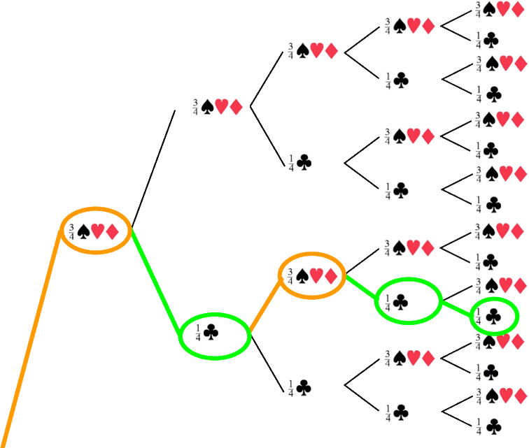 Nun könnte man all die Wege einzeichnen, die derart zum Ziel führen. Für einen einzigen Fall aus der oberen Hälfte des Baumdiagramms sei das auch mal vorgemacht: