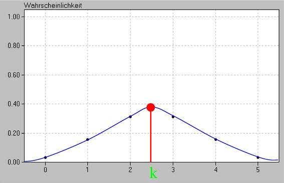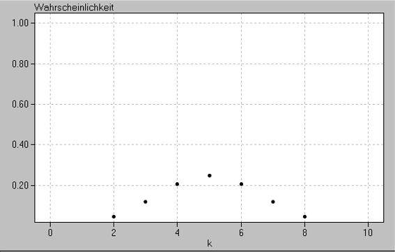 Hier liegt nun die Gaußsche Glockenkurve in der Tat hübsch mittig, und wie zu erwarten liegt ihr Maximum bei 5 •