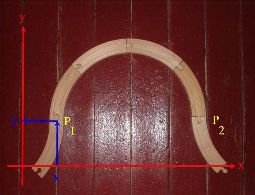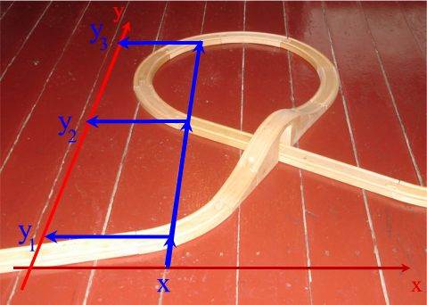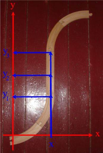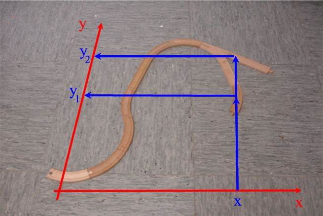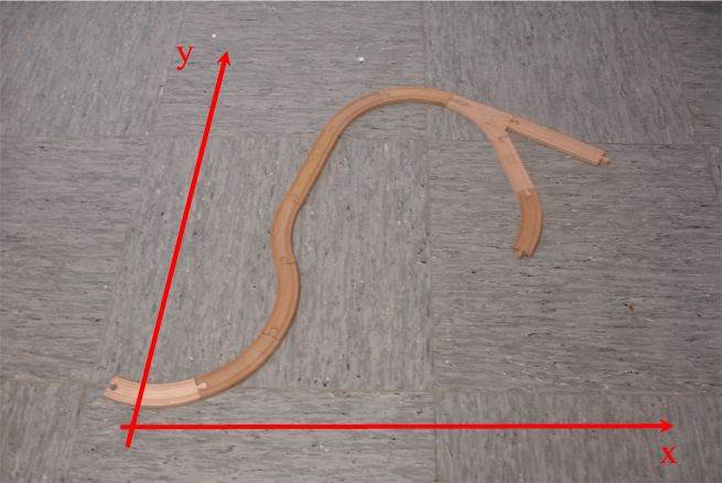 senkrecht zueinander stehen, was natürlich daran liegt, dass ich die Brio-Bahnen nicht von oben, sondern schräg von der Seite fotografiert habe: die Bodenfliesen des Klassenraums zeigen, dass die Koordinatenachsen an ihnen ausgerichtet war.