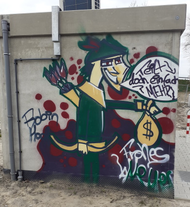Als „Rächer der Enterbten“ und insbesondere der Witwen und Waisen hat der edle Räuber Robin Hood stets nach dem Motto „take it from the rich, give it to the poor“ gehandelt, also UmverTEILUNG (auf dem Graffito von Dollars) von oben nach unten betrieben. Und so ist dann wohl auch