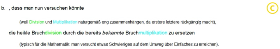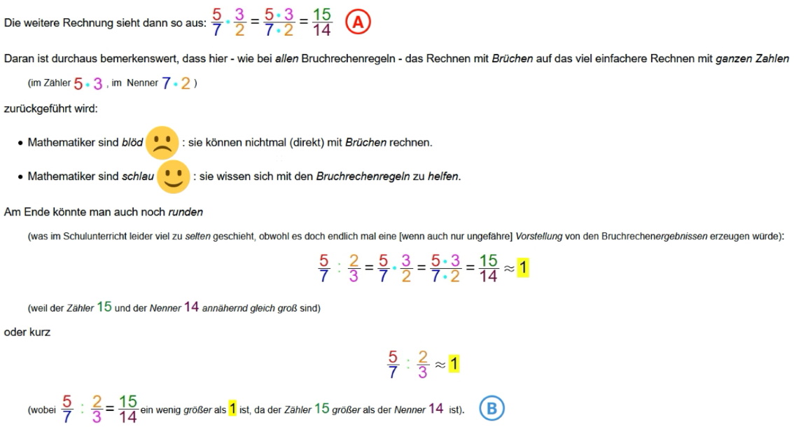 Nun entstammt allerdings nur die zweite, sehr knappe Passage den Überlegungen zur Bedeutung der Bruchdivision und Herleitung des Rechenrezepts, und das scheint mir als Rechtfertigung für ein Verstehen im 2. und 3. Sinn doch arg mager.