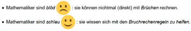 Daran ist durchaus bemerkenswert, dass hier - wie bei allen Bruchrechenregeln - das Rechnen mit Brüchen auf das viel einfachere Rechnen mit ganzen Zahlen