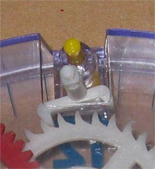 und dann bemerkt man etwas Höchstinteressantes: sämtliche Zahnräder beginnen augenblicklich mit einer rasend schnellen Drehung - und das weiße Zackenrad dreht sich am schnellsten. Offensichtlich wird es also nicht vom "Balken" bzw. Pendel, sondern woanders her angetrieben. Baut man "Balken" und Pendel wieder ein und sieht genauer hin, so erkennt man auch, dass der "Balken" das weiße Zackenrad zwar ab und zu blockiert, aber nicht antreibt.