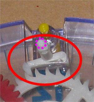 obwohl das schwarze Zahnrad direkt hinter dem rosafarbenen Zahnrad liegt, wird es "früher" angetrieben, nämlich direkt von dem rotweißen Aufzieh-Rad;