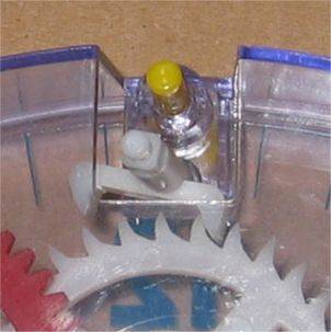 Wenn man sich nun das weiße Zackenrad ganz oben genauer anschaut, sieht man dort einen kleinen zusätzlichen Mechanismus in Form einer Art weißen Balkens (hier zur Verdeutlichung rot umrahmt):
