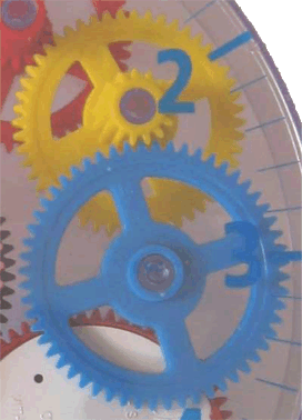 Auf diesem Bild sieht man nun auch, dass jeweils das kleine (hier gelbe) Rädchen auf das nächste große (hier blaue) Rädchen einwirkt.