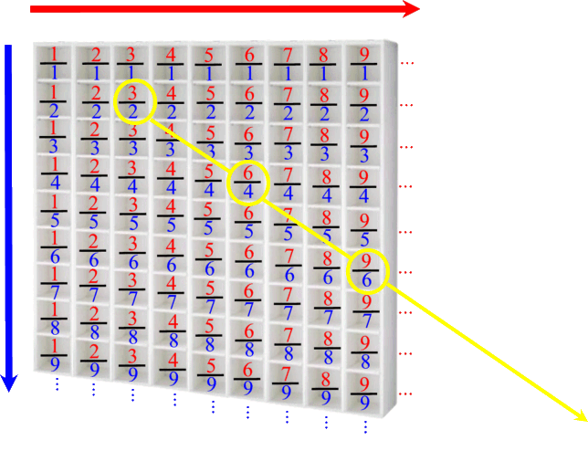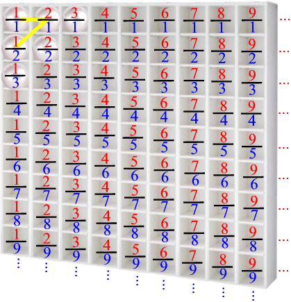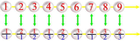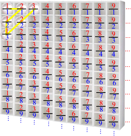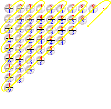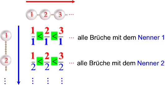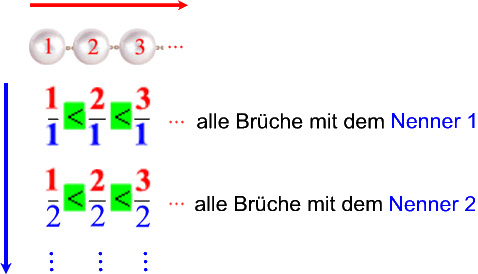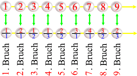 Also kann jeder natürlichen Zahl ein Bruch und umgekehrt jedem Bruch eine natürliche Zahl zugeordnet werden:
