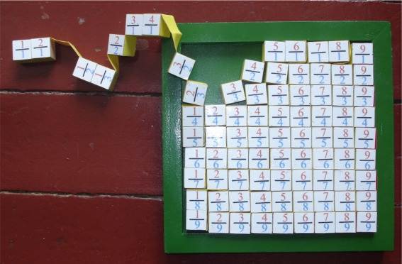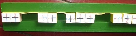 Es gibt mehrere gesuchte eindimensionale (und systematische!) Perlenkettenwege durch das Regal, aber fangen wir zaghaft mit einem der möglichen Wege an - und beginnen, um wirklich alle Brüche zu erwischen, oben links in der Ecke mit