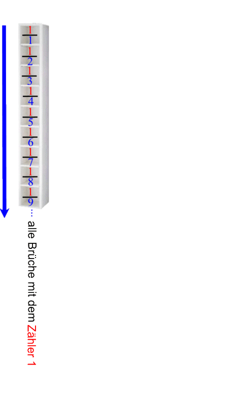 Um aber unser bisher erstelltes Schema noch anschaulicher zu machen, sortieren wir die Brüche auf die soeben dargestellte Weise in ein Regal durch sukzessive Ergänzung neuer Regalbretter untereinander ein: