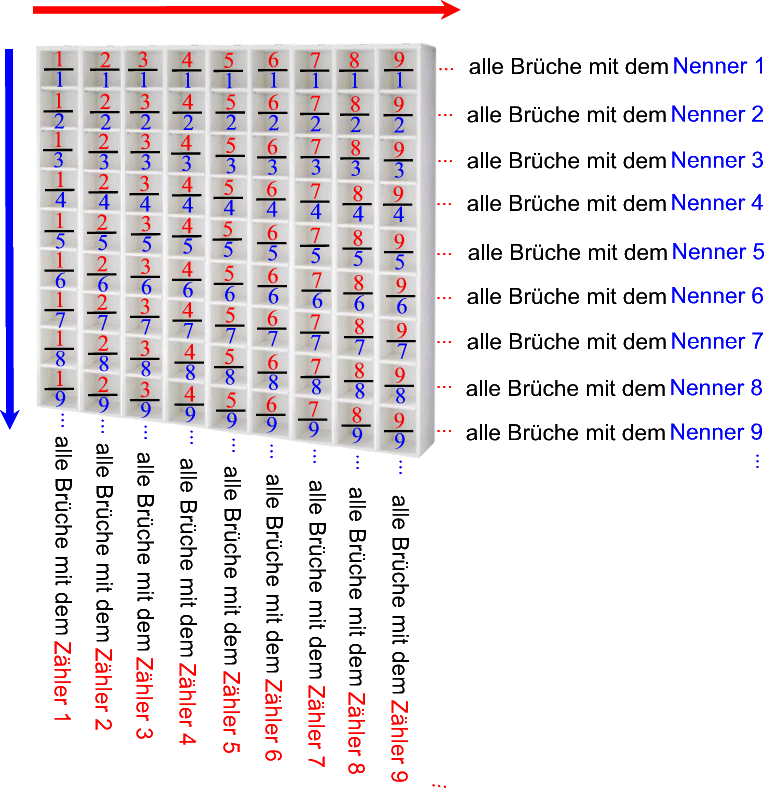 (Und wieder: es gibt offensichtlich genauso viele Brüche mit dem Nenner 2 [oder 3, 4, 5 ...], wie es natürliche Zahlen gibt.)