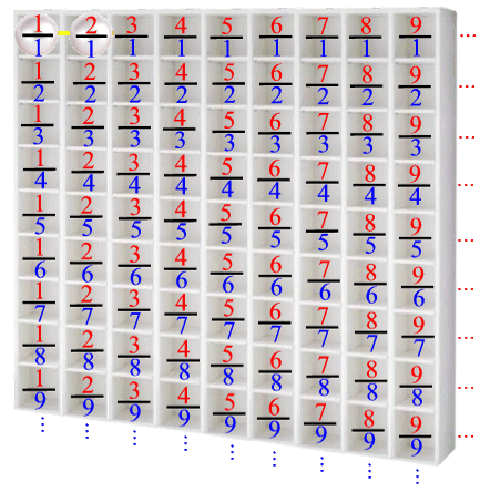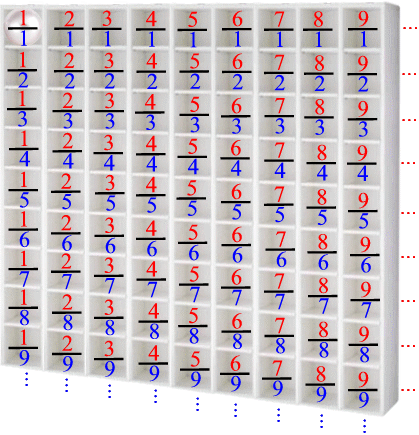 ), und all diese natürlichen Zahlen kommen in der Tat in unserem Regal vor, und zwar schon in der 1. Zeile! Genauso kommen aber auch viele nicht-natürliche Zahlen, also echte Brüche in unserem Regal vor, nämlich eben z.B.