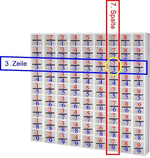 Vergewissern wir uns zu allererst, dass darin auch tatsächlich alle Brüche vorkommen. Dazu machen wir uns klar, dass das Regal zweidimensional ist, also beispielsweise die Position des Bruchs