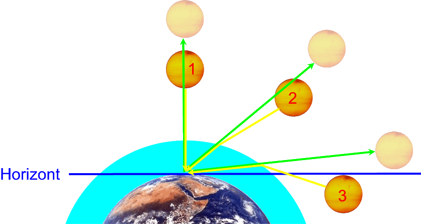 Das Dollste ist aber, dass die Sonne, wenn wir sie untergehen sehen, in Wirklichkeit schon längst untergegangen ist, dass also der Sonnenuntergang eine Chimäre ist