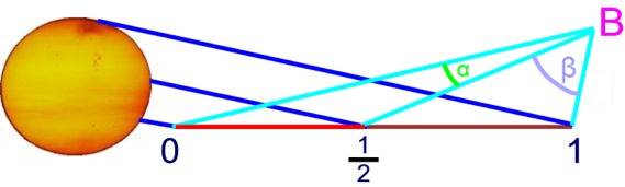 Zum Betrachter B laufen die Strahlen aber nicht mehr parallel weiter, wodurch sich zwei verschiedene Winkel α und β ergeben. Also folgt: