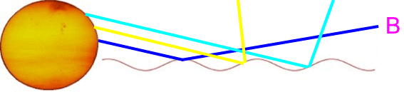 Angenommen, es gäbe einen Lichtreflex 0 außerhalb des blauen Segments: der Lichtstrahl, der ihn erzeugen würde, müsste ja seinen Ursprung seitlich von der Sonne haben:
