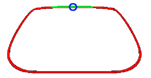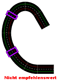 Zu kurze Geraden – immer wieder beliebt! Eine Gerade kürzer als 3 oder 4 Standardgeraden, ist keine Gerade. Ein Gerades stück soll dazu dienen den Regler auch mal durchzudrücken. Auf einer Geraden mit weniger als 4 Standardgeraden ist das einfach nicht Ansatzweise möglich. In Kombination mit einer Kurve 1 als Eingangskurve auf die Gerade und eine Kurve 1 als Ausgangskurve von der Gerade haben wir wieder den so oft hier erklärten unterbruch des „Flusses“ Solche Planungen sollte man lieber vermeiden und lieber die Kurvenpassage flüssiger gestalten."