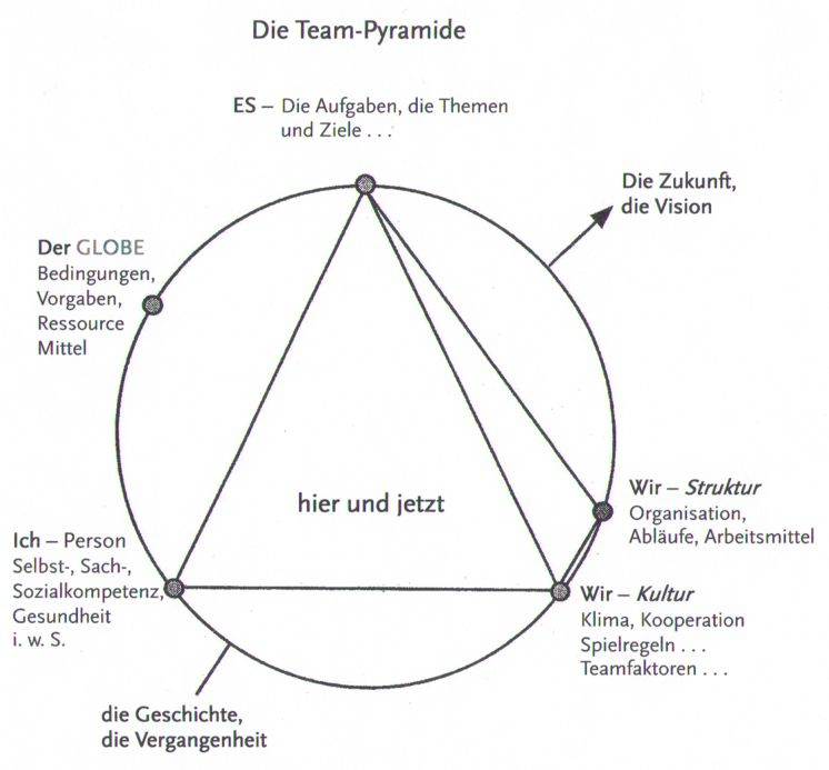 Laut Beschriftung bedeutet "GLOBE" nun aber "Bedingungen, Vorgaben, Ressource Mittel", und dadurch, dass der "GLOBE" die Pyramide umhüllt, soll wohl gesagt werden, dass keine Teamarbeit ohne die umgebende Infrastruktur möglich ist.