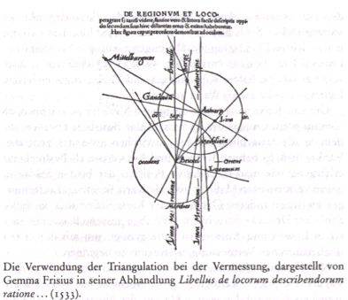 Indem Gemma das Land mit imaginären Dreiecken überzog, gab er den Geographen auch ein verblüffendes neues Instrument an die Hand, um die Oberfläche zu vereinfachen, die sie graphisch darstellen wollten. Bei der Vermessung entstand durch die Triangulation eine mimetische (die Natur nachahmende) Karte, die in einem Maßstab von 1:1 gleichsam über die Landschaft gelegt wurde. Landkarten als Nachbildungen der Realität zu verstehen war eine der Wahrnehmungsveränderungen, die es den Kosmographen ermöglichte, sich von den imaginären Welten des Mittelalters loszulösen."Schon allein der Kapiteltitel, insbesondere aber auch durch die von mir rot bzw. blau markierten Sätze wird klar, wie überaus bedeutsam diese Methode der "Triangulation" für alle weitere Erdvermessung war und bis heute ist.