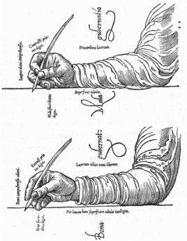 "Im dritten Kapitel illustrierte der Autor [= Mercator] mit Hilfe einer geometrischen Zeichnung, wie man ein quadratisches Feld in zwölf gleiche Streifen teilte - den Längenkreisen einer Karte nicht unähnlich. In dieses Feld zeichnete Mercator die drei elementaren Striche des Buchstaben Y, zwei von ihnen mit 3,75 Grad Abweichung von der Vertikalen und eine Diagonale aus der Hypotenuse eines umgekehrten, stumpfwinkligen Dreiecks. Das Prinzip - eine Schrift aus parallel stehenden Strichen zu gestalten, die etwas unter 5 Grad geneigt sind - war ganz einfach und wurde in seiner graphischen Darstellung klar veranschaulicht."