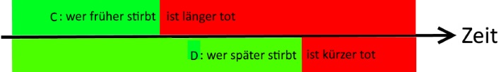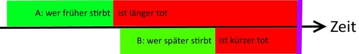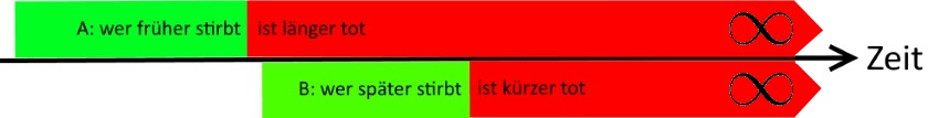 (auch das widerspräche der Voraussetzung „wer früher stirbt, ist länger tot“, denn dann wäre ja jeder nur einen Augenblick lang tot; und es wäre ja auch zu schön, um wahr zu sein),