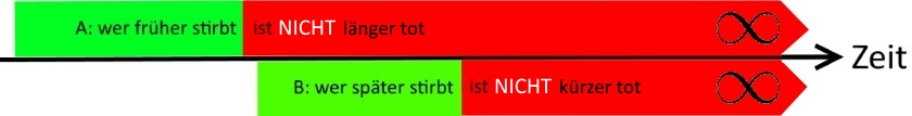 (Wir haben hier also einen mathematischen „Widerspruchsbeweis“ geführt: eine [scheinbare] Möglichkeit [hier ein unendlich langes Totsein] ist falsch [eben keine Möglichkeit], wenn sie der Voraussetzung [hier „wer früher stirbt, ist länger tot“] widerspricht.)