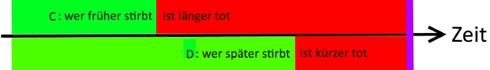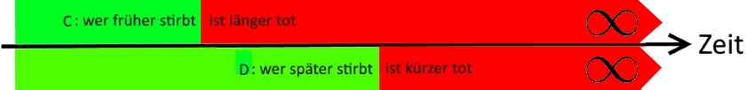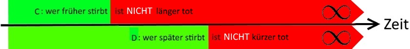 “Die Unendlichkeit ist aber immer gleich lang“ bedeutet, dass A, B, C und D allesamt gleich lang tot sind, was aber dem Satz „wer früher stirbt, ist länger tot“ widerspricht.