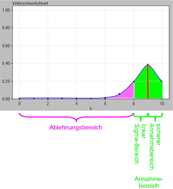 Komplementär dazu reicht der "Ablehnungbereich" hier von 0 (= gar keinem) Treffer bis 7 Treffer: wenn der Schütze also zwischen 0 und 7 mal trifft, glauben wir es ihm nicht, dass er üblicherweise mit der Wahrscheinlichkeit p = 0,9 trifft, und unterstellen ihm, dass er ein Angeber ist.