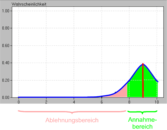 Diesen Bereich nennen wir auch "Annahmebereich", und im vorliegenden Fall heißt das: wenn der Schütze zwischen 8 und 10 mal trifft, glauben wir ihm, dass er üblicherweise mit der Wahrscheinlichkeit p = 0,9 trifft, dass er also tatsächlich ein so guter Schütze ist, wie er behauptet.