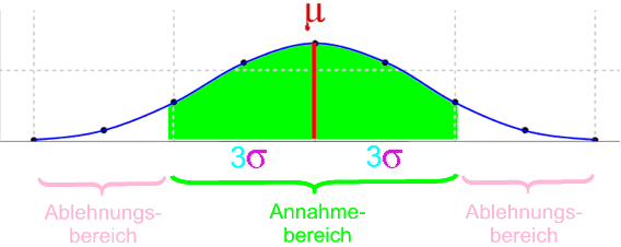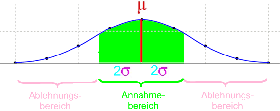 dann zu fällen, wenn die Ergebnisse des Experiments = Probeschießens nicht "allzu sehr" (???) vom Erwarteten abweichen, wenn sie also in einem gewissen Bereich um den Erwartungswert herum liegen, der sich aus meiner Anfangsannahme ergibt
