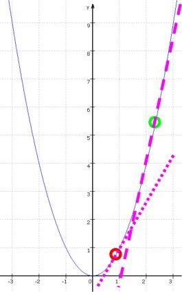 (und so erhalte ich analog für jeden Punkt Q(x|y) die ganz eigene Steigung in diesem Punkt; oder anders gesagt: f (x) = 2x ist - gar nicht so selbstverständlich! - wieder eine hübsche und zudem einfachere, nämlich lineare Funktion, die jedem Punkt Q kontinuierlich die Steigung in eben diesem Punkt zuordnet.)