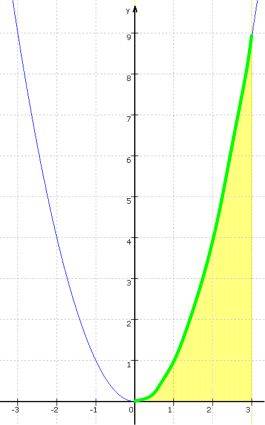 wenn ich nun die Fläche unter der Parabel bis zum Punkt P(3|9) wissen will, setze ich einfach die 3 für x in F(x) ein und erhalte als Fläche