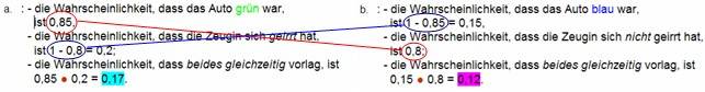 0,15 ● 0,8 = 0,12.Eigentlich bräuchte man gar nicht weiter zu rechnen: das Ergebnis 0,17 für a. ist (unserer Intuition widersprechend!) größer als das Ergebnis 0,12 für b.