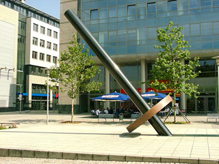 (vermutlich "Kunst am Bau", also meistens das glatte Gegenteil von Kunst: da toben sich die Stahl- und Bronze"künstler" aus, denn Hauptsache, das Zeugs ist wetter- und vandalismusfest, "markant" - und gefällig):