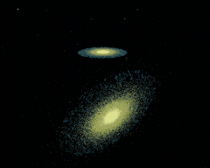 durch das Weltall; z.B. bewegen sich unsere Milchstraße und die ihr nächste Galaxie, der Andromedanebel, aufeinander zu und werden eines schönen (glücklicherweise noch sehr fernen) Tages sogar ineinander krachen: