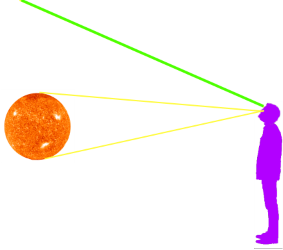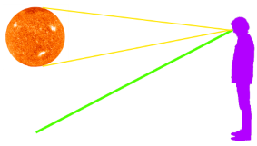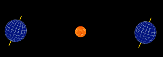 (Dabei ist die Sonne im Vergleich mit der Erde absichtlich viel zu klein dargestellt, um zu symbolisieren, dass sie sehr weit von der Erde entfernt ist und deshalb ja auch tatsächlich - von der Erde aus gesehen - am Himmel sehr klein erscheint.)
