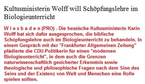 Immerhin hat die hessische Kultusministerin aber mit einem durchaus Recht: selbstverständlich gehören (vermehrt!) auch "theologische und philosophische Fragen" in den Biologieunterricht, denn in den allermeisten Fällen sind NaturwissenschaftslehrerInnen bislang ja derart philosophisch unbeleckt bis geradezu ignorant, dass eine "Konjunktivierung" wissenschaftlicher Erkenntnisse in ihrem Unterricht bislang gar nicht vorkommen kann