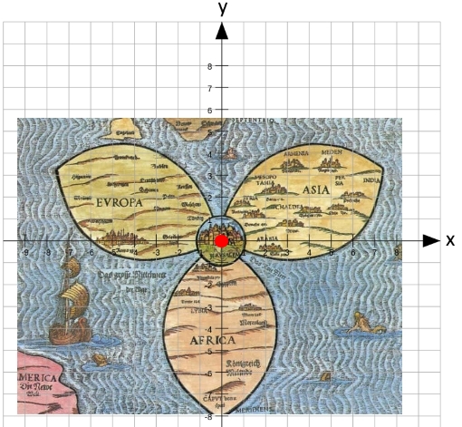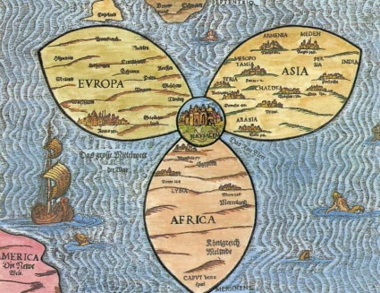 (Die Weltkarte Heinrich Büntings ist allerdings offensichtlich nicht mehr mittelalterlich, sondern frühneuzeitlich, da auf ihr links unten bereits Amerika zu sehen ist - und damit die Zentrierung um Jerusalem nicht mehr so ganz funktioniert. Und in der Tat ist die Karte 1581 entstanden.)