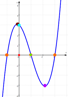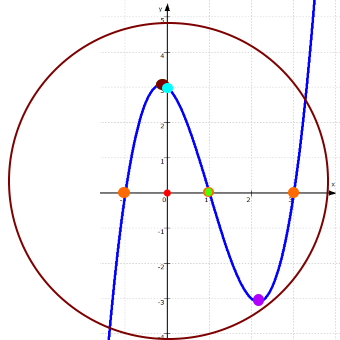 die drei Nullstellen, also die Schnittpunkte mit der x-Achse,