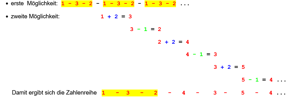 (obwohl sie durchaus nach einem [wenn auch nicht auf den ersten Blick ohne Rechnen deutlichen] Muster funktioniert, denn jede Zahl ab der dritten ist die Summe der jeweils beiden vorherigen, d.h. hier liegt der Anfang der berühmten Fibonacci-Folge vor).