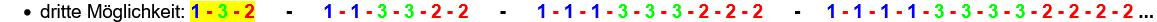 Die jetzt eigentlich nötige Berechnung der Wahrscheinlichkeit spare ich mir hier aber, weil es mir hier um einen anfänglich anderen, anschaulichen Zugang zu Mustern geht.