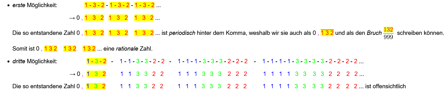 Besonders interessant sind da die erste und die dritte Möglichkeit, wenn wir die vorkommenden Zahlen als Nachkommaziffern benutzen: