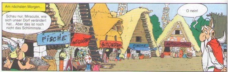 im gallischen Dorf einkaufen, und zwar insbesondere Fisch und Antiquitäten, eröffnen die geschäftstüchtigen Dorfbewohner eben Fisch- und Antiquitätengeschäfte, und zwar natürlich nicht hübsch nebeneinander