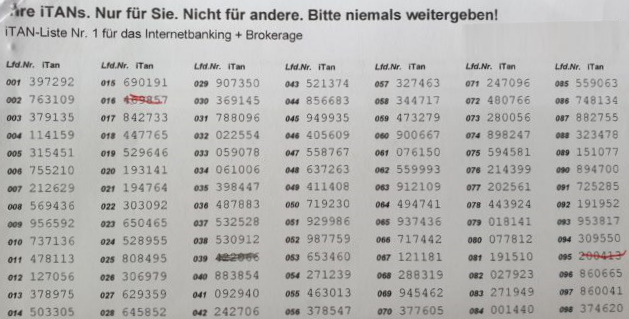 (Der Kunde hat schon die drei von ihm durchgestrichenen TANs für drei Überweisungen verbraucht.)
