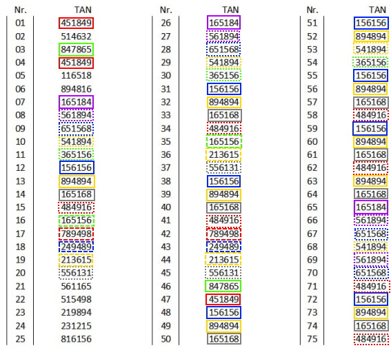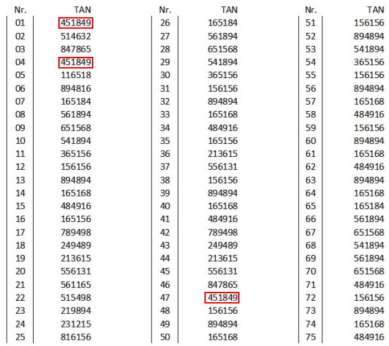 Wenn man außerdem merkt, dass die Liste zeilenweise zu lesen ist, und jetzt mal auf die jeweils zweite Ziffer der TANs schaut, stellt man fest, dass da nacheinander die TAN-Anfänge 11, 12, 13, 14, 15, 16 und 17 vorkommen, was bei zufällig erzeugten TANs zwar auch wieder möglich, aber noch unwahrscheinlicher ist.
